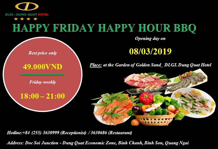 BBQ party is held from 18h:00 to 21h:00 (called a golden hour) Friday weekly at the Garden of Golden Sand, opening day on 8th Mar 2019 with an attractive menu of meats and fresh kinds of seafood. Best price only is 49.000VNĐ