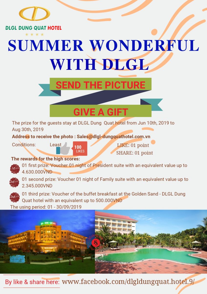 SEND THE PICTURE – GIVE A GIFT, DLGL Dung Quat hotel is pleased to introduce the preferential promotion “ SUMMER WONDERFUL WITH DLGL” to get ready for the happy & loving in 2019 summer season.