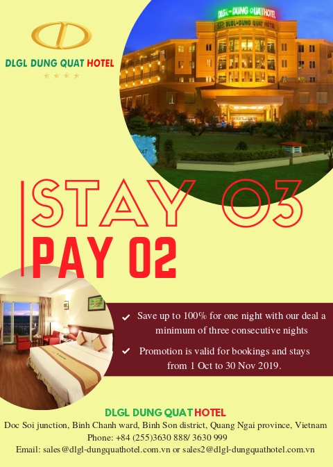 On the occasion, welcome 10 years anniversary of Dlgl Dung Quat Hotel, we would like to express our respect and thankfulness for all customer with support and cooperation during our development by the name DLGL DUNG QUAT HOTEL with the deal “STAY 03, PAY 02”